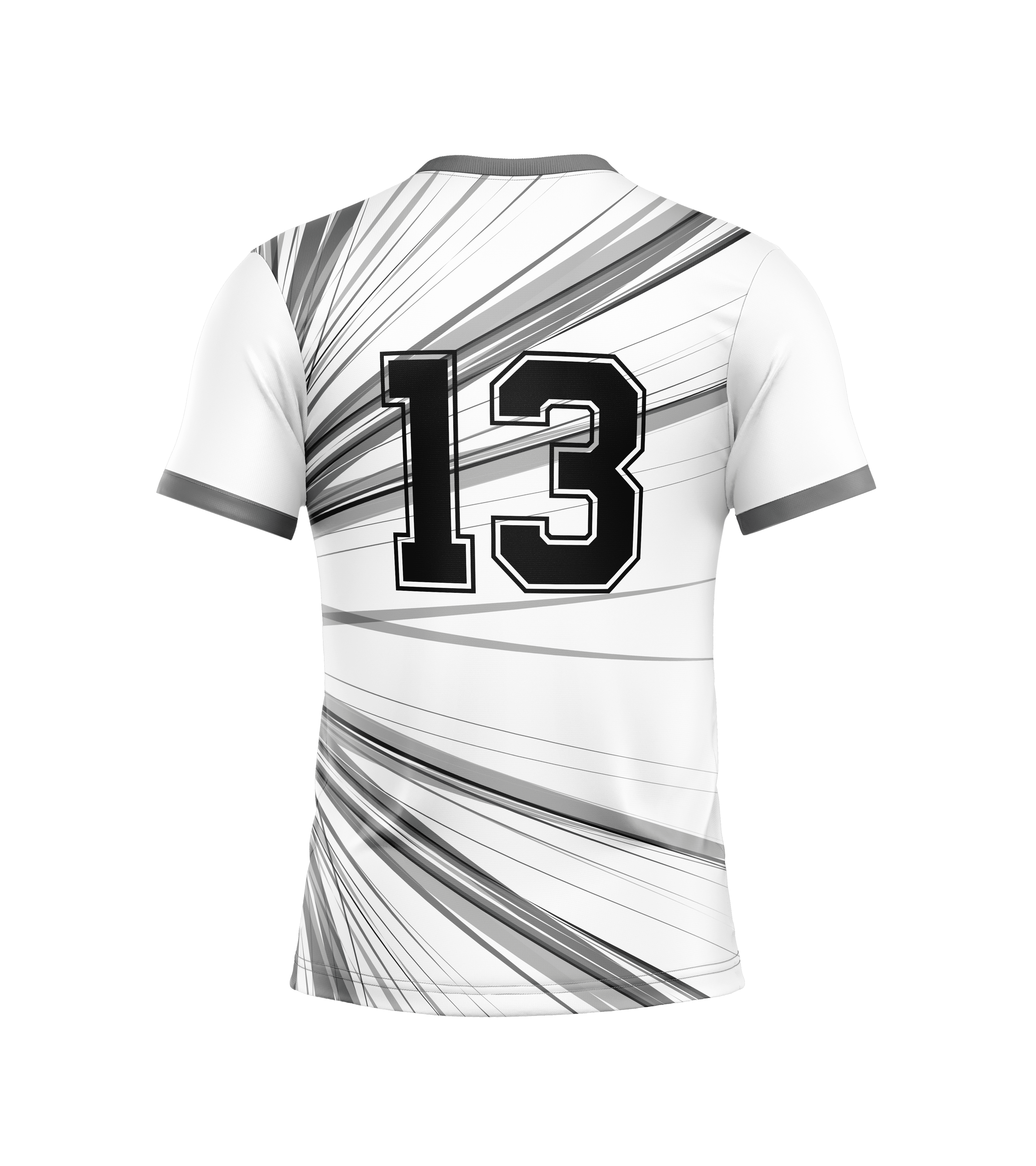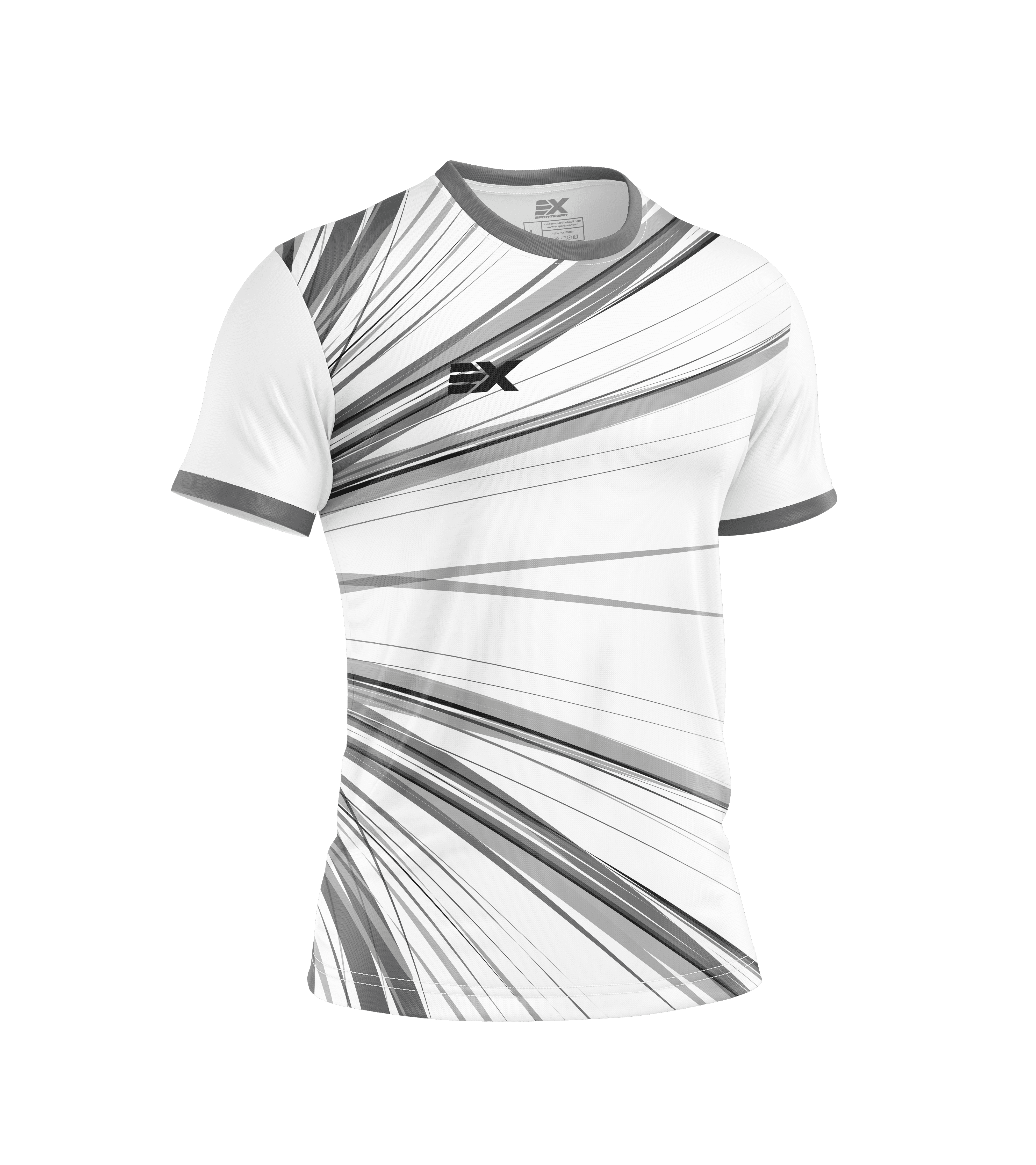 Tiene un corte regular para hombres. En mujeres quedara estilo “oversize”. Blanco y negro. Con ribetes gris ceniza en cuello y mangas. Mangas diferenciadas del torso. Diseño lineal en tonos negros y grises.
