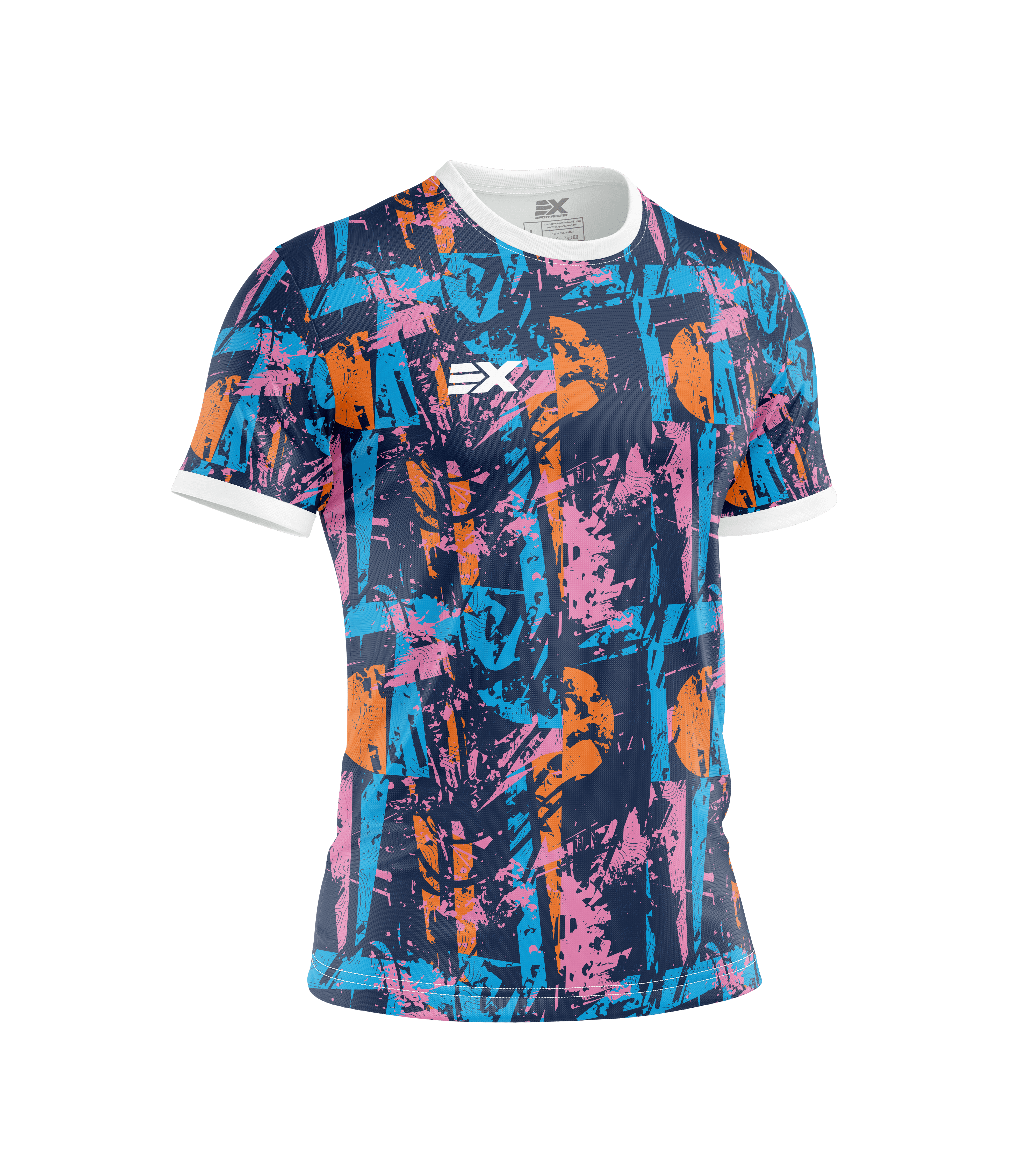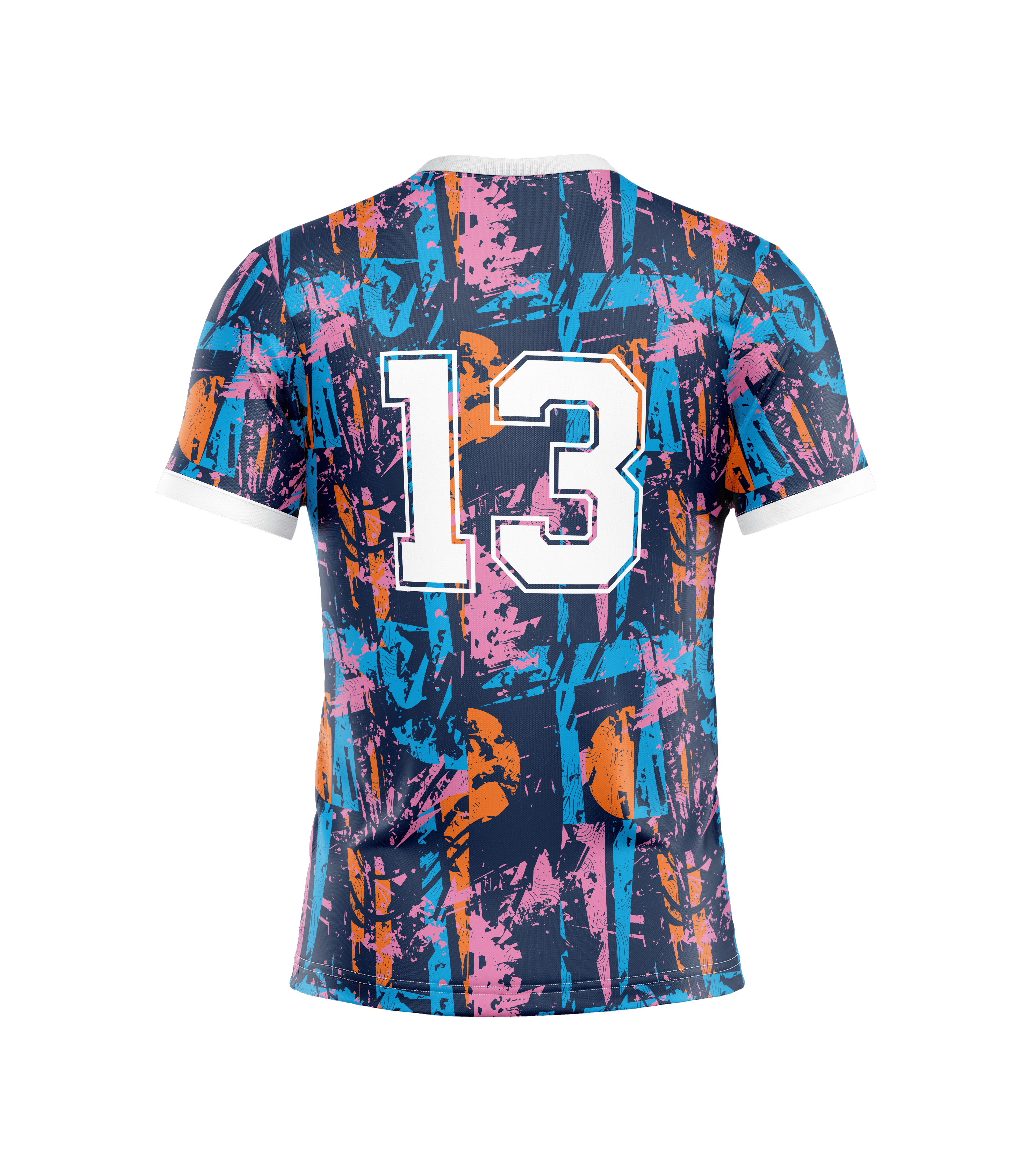 Tiene un corte regular para hombres. En mujeres quedara estilo “oversize”. Multicolor, destacando el azul, naranja, rosa. Ribetes de cuello y mangas en blanco. Inspirada en el futbol de calle.